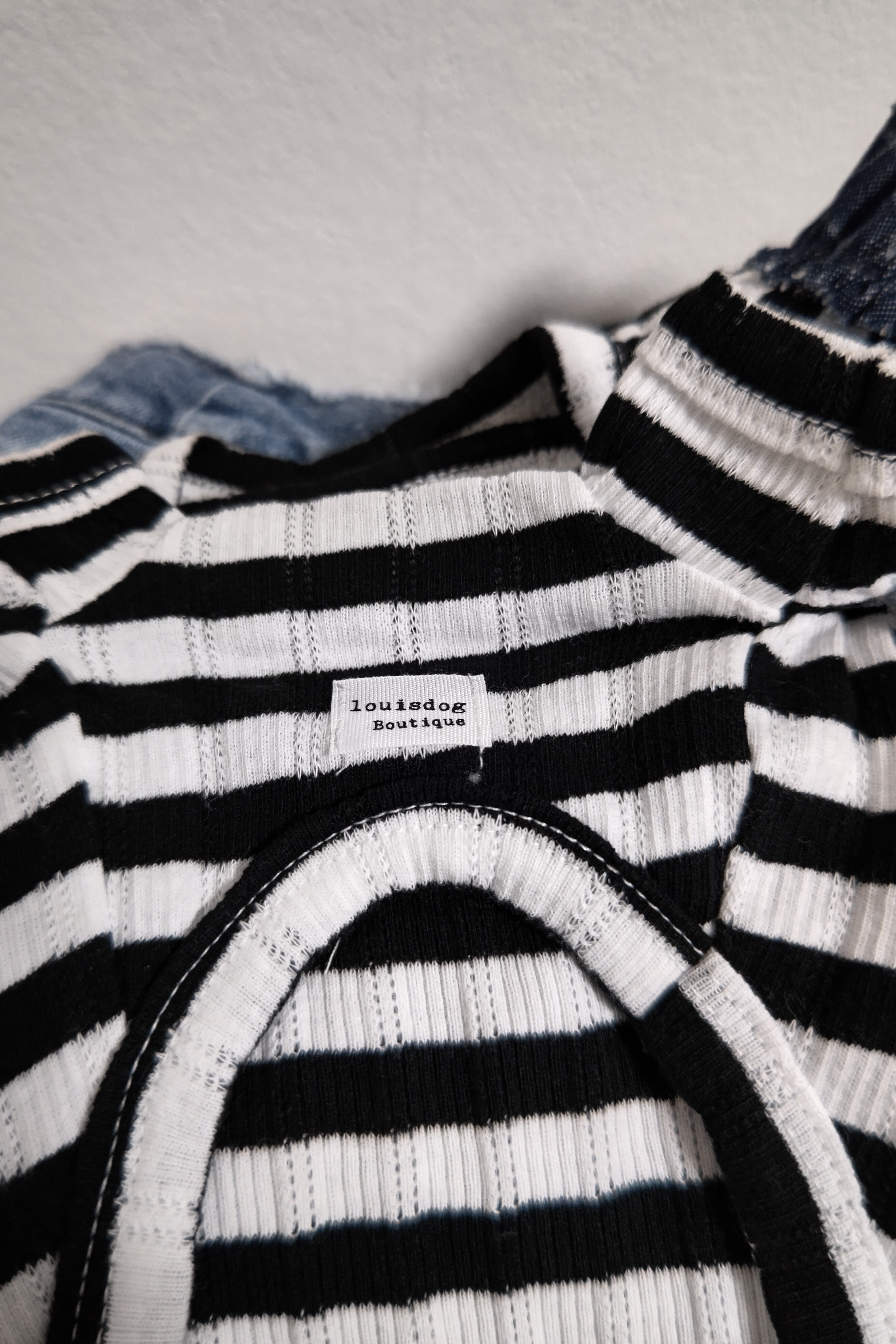 黒と白のボーダーTシャツに袖の部分がポイントのデニム素材♪ 1枚で差が出る、ワンランク上のオシャレわんちゃんに! デニムパンツやスカートに合わせても可愛い着こなしに。。。