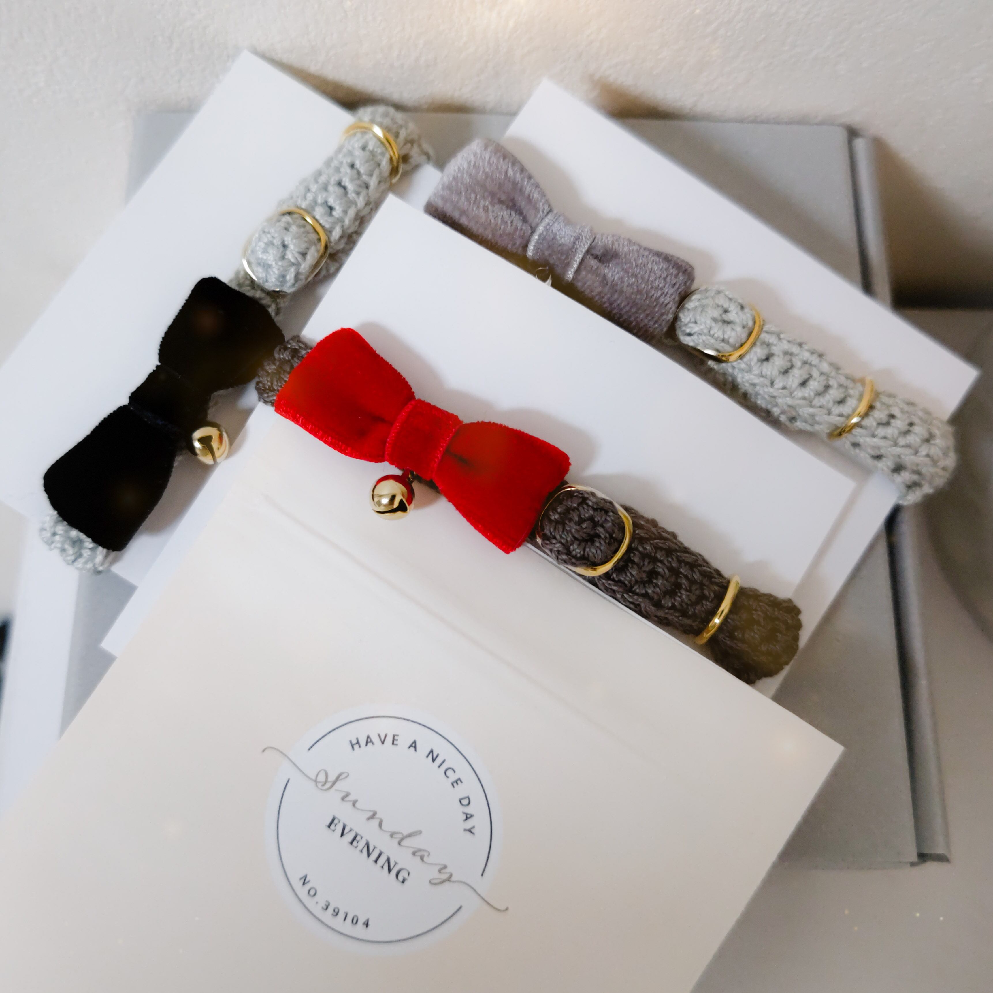 1つ1つ手編みで、優しい素材の室内用首輪です。
